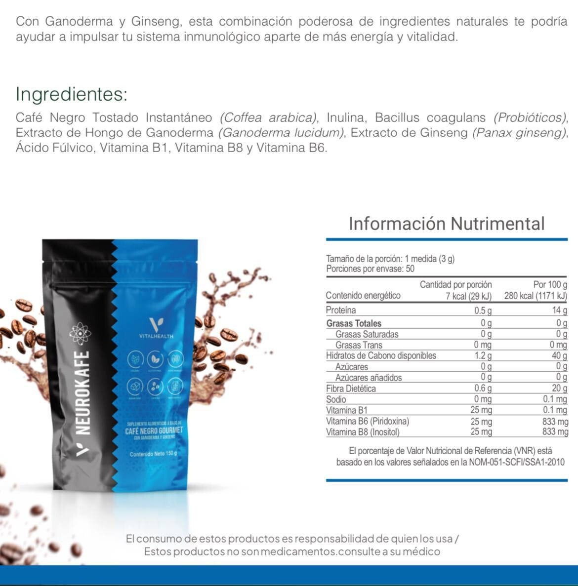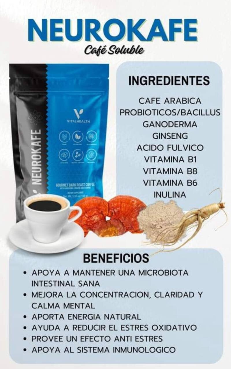 - Neurokafe es un café adaptogénico con ganoderma, nootrópicos y probióticos para favorecer la concentración mental, la armonía intestino-cerebro y una energía estimulante.