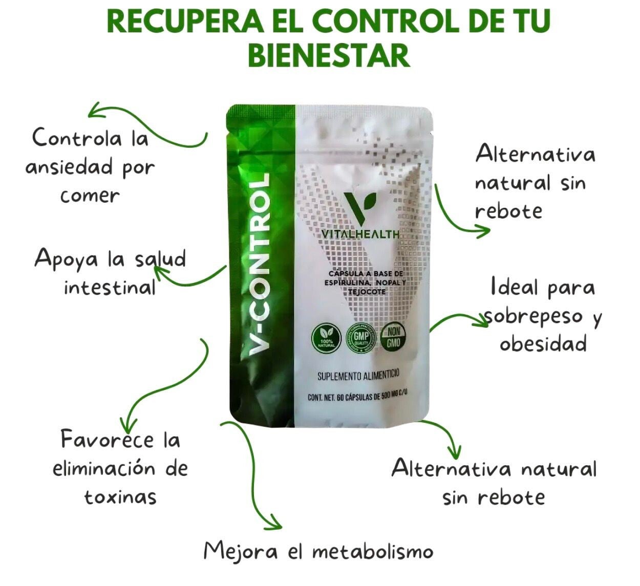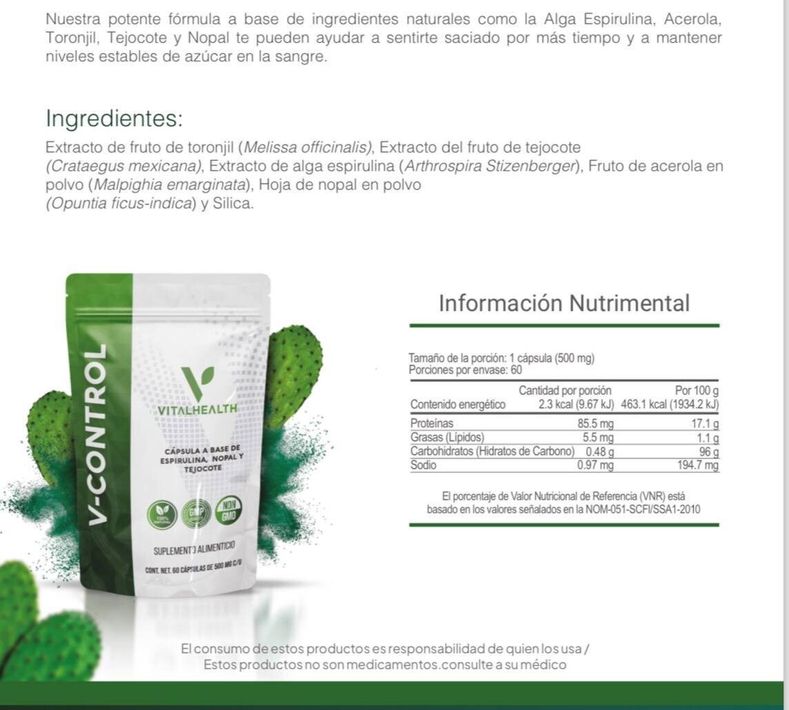 - Control combina adaptógenos de apoyo, nutrientes y productos botánicos como el bálsamo de limón, espirulina, acerola, higo chumbo que ayudan a mantener la energía equilibrada, azúcar en la sangre, y el estado de ánimo al tiempo que ayuda suavemente a los órganos de desintoxicación.